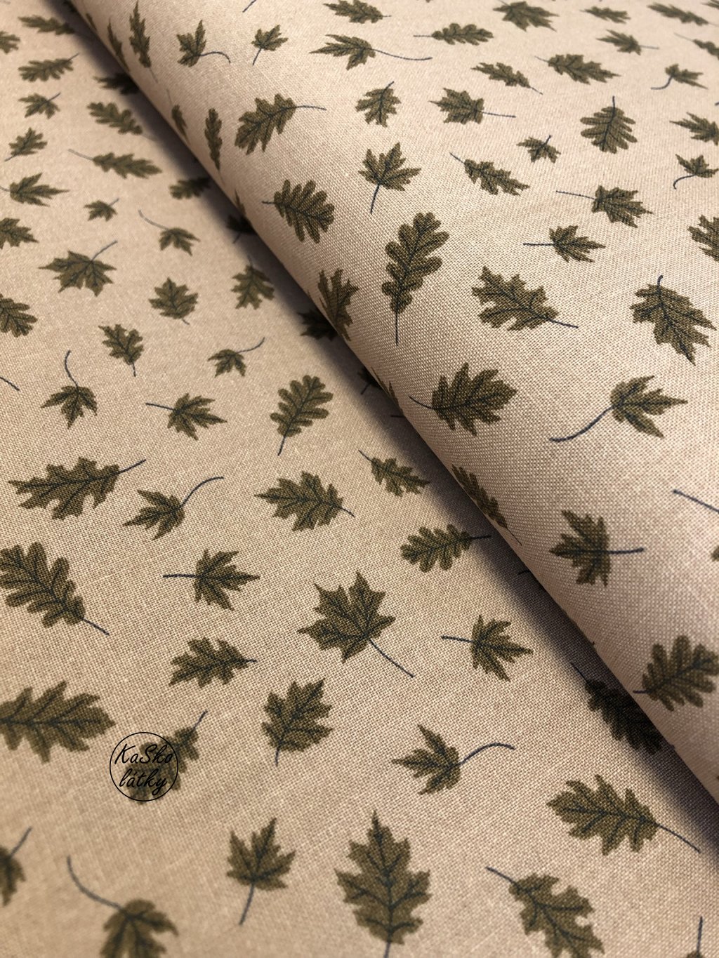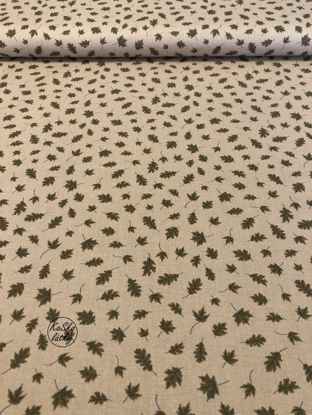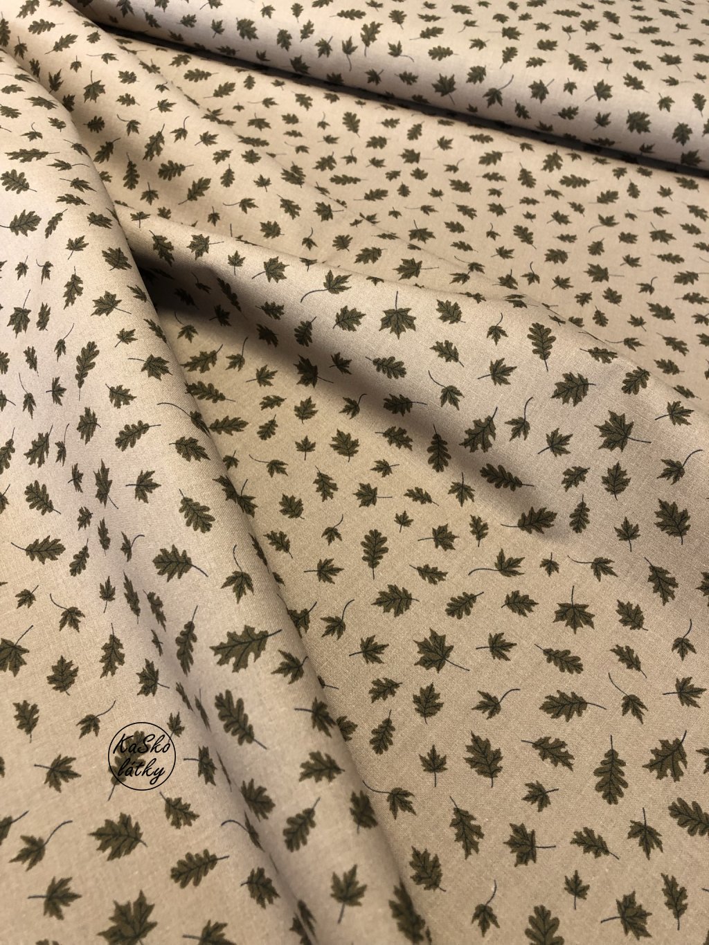 Bavlněná látka hnědo-šedé listy na světle hnědé