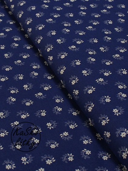 Bavlněná látka modré květy s lístky z puntíků na bílé
