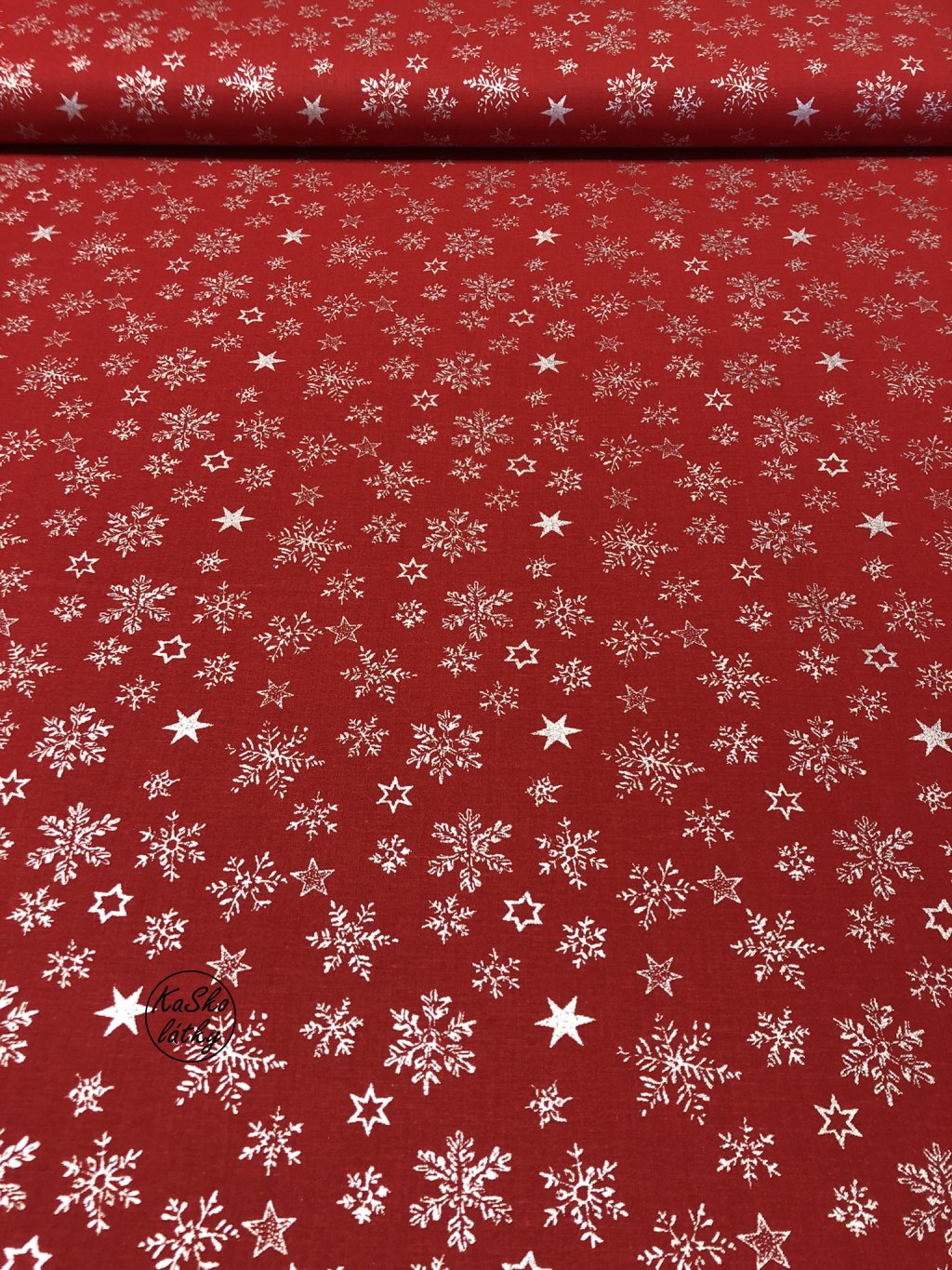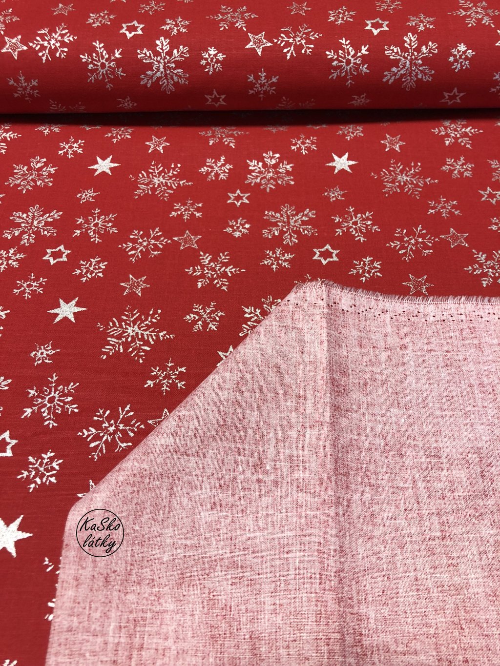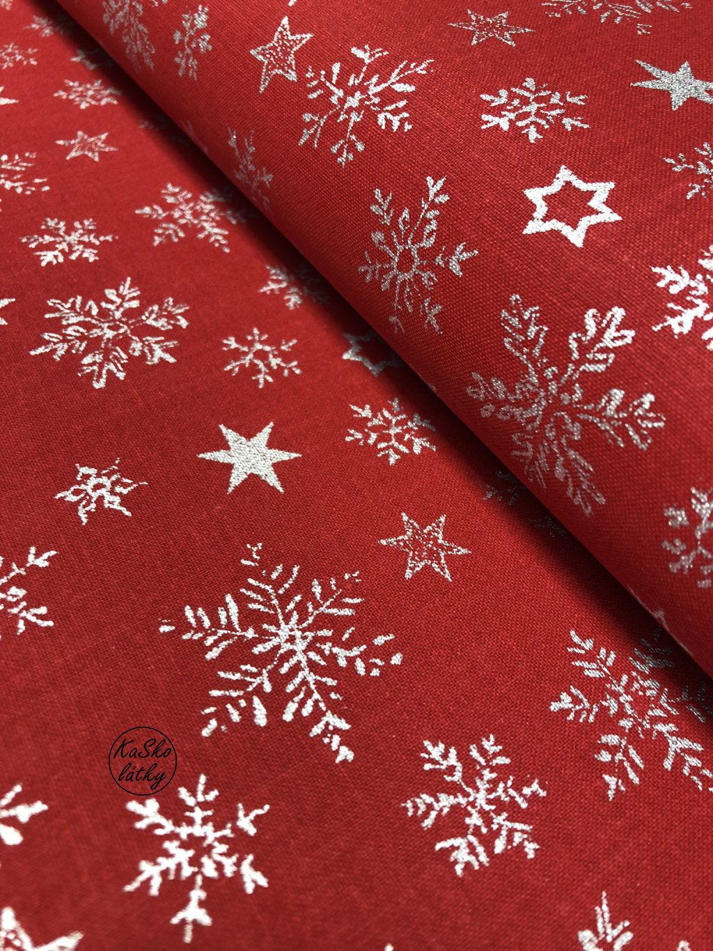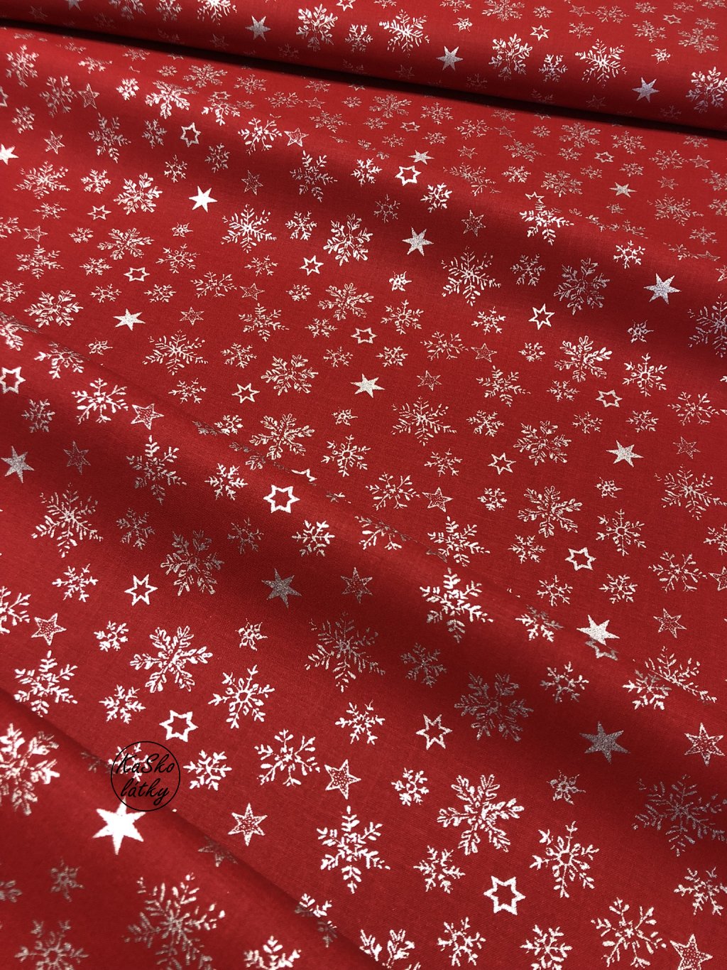 Bavlněná látka stříbrné sněhové vločky a hvězdy na červené