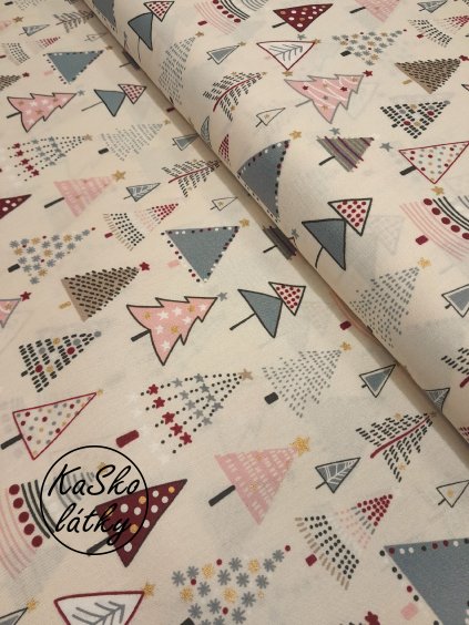 Bavlněná látka vánoční stromečky na růžové