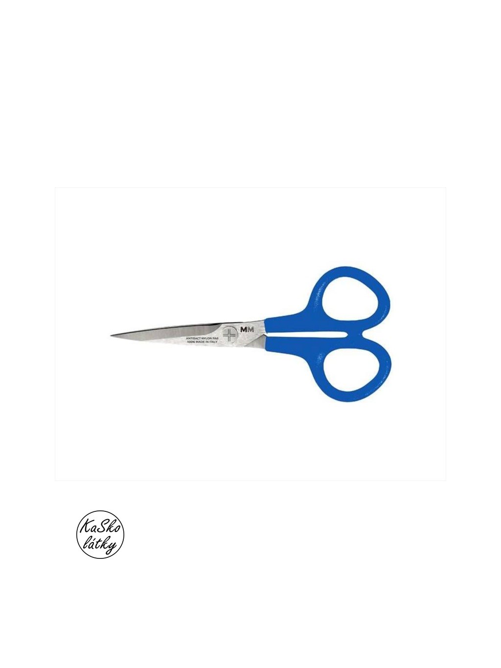 Vyšívací nůžky, velikost 5" (13,5 cm). Čepele z nerezové oceli AISI 420 W. 1.4028, tvrdost oceli 53-54 HRC, symetrická rukojeť z modrého nylonu PA6 s antibakteriálními vlastnostmi.