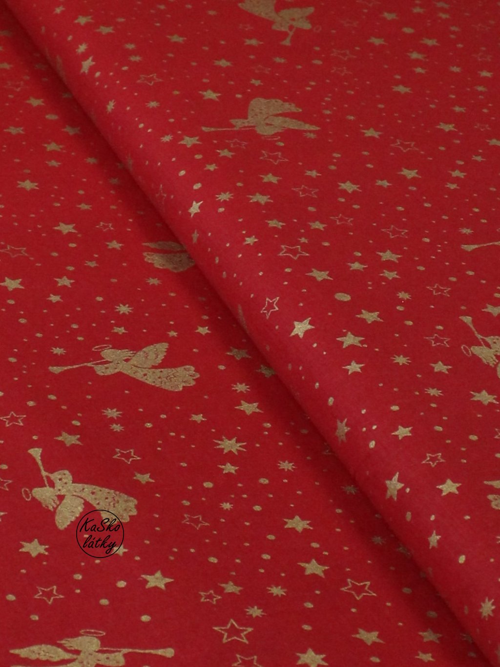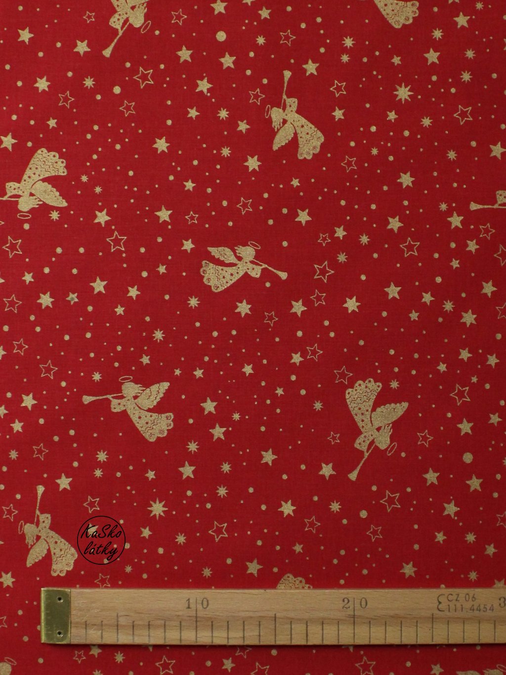 Zbytek - Bavlněná látka anděl s trumpetou na červené 40 x 150 cm