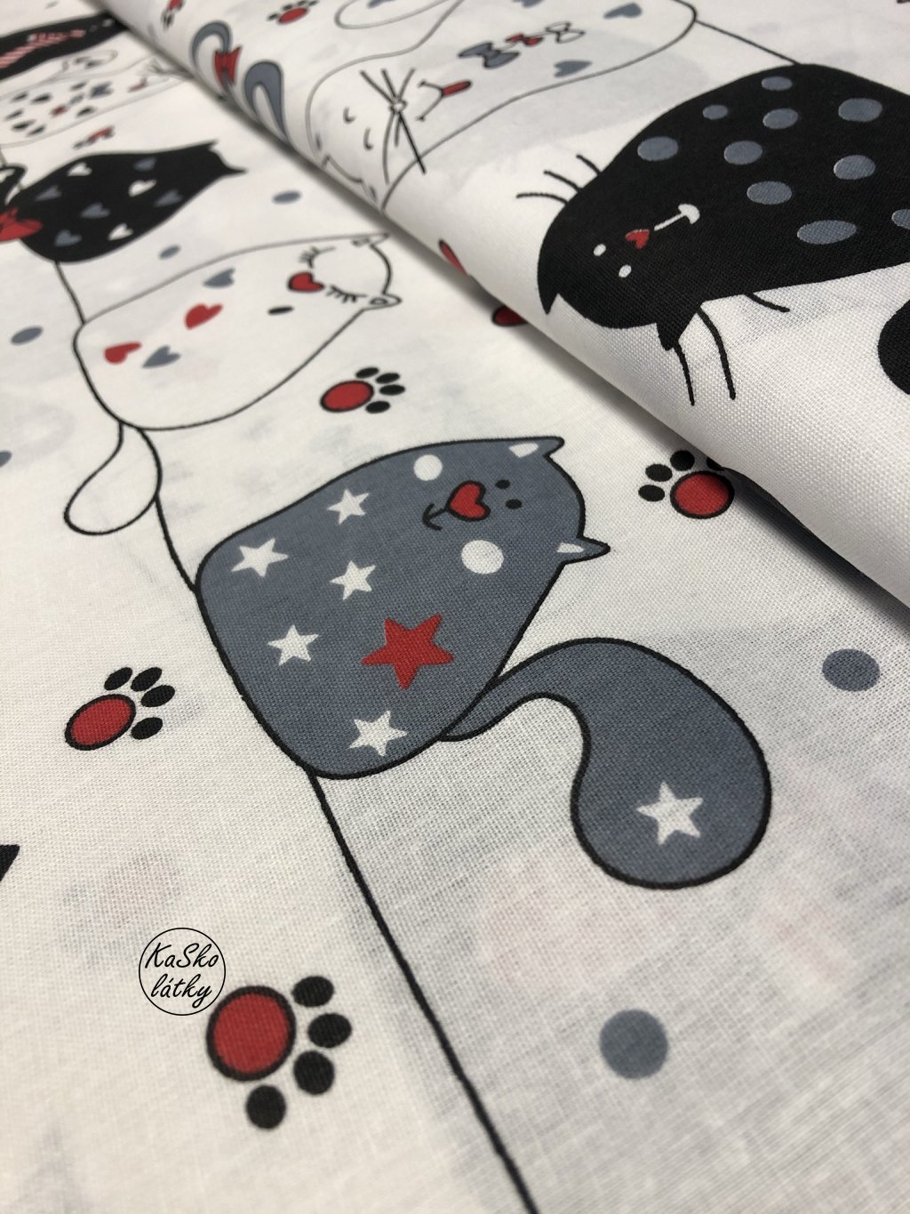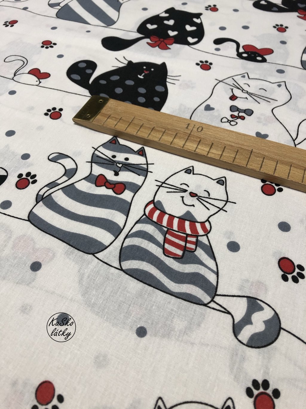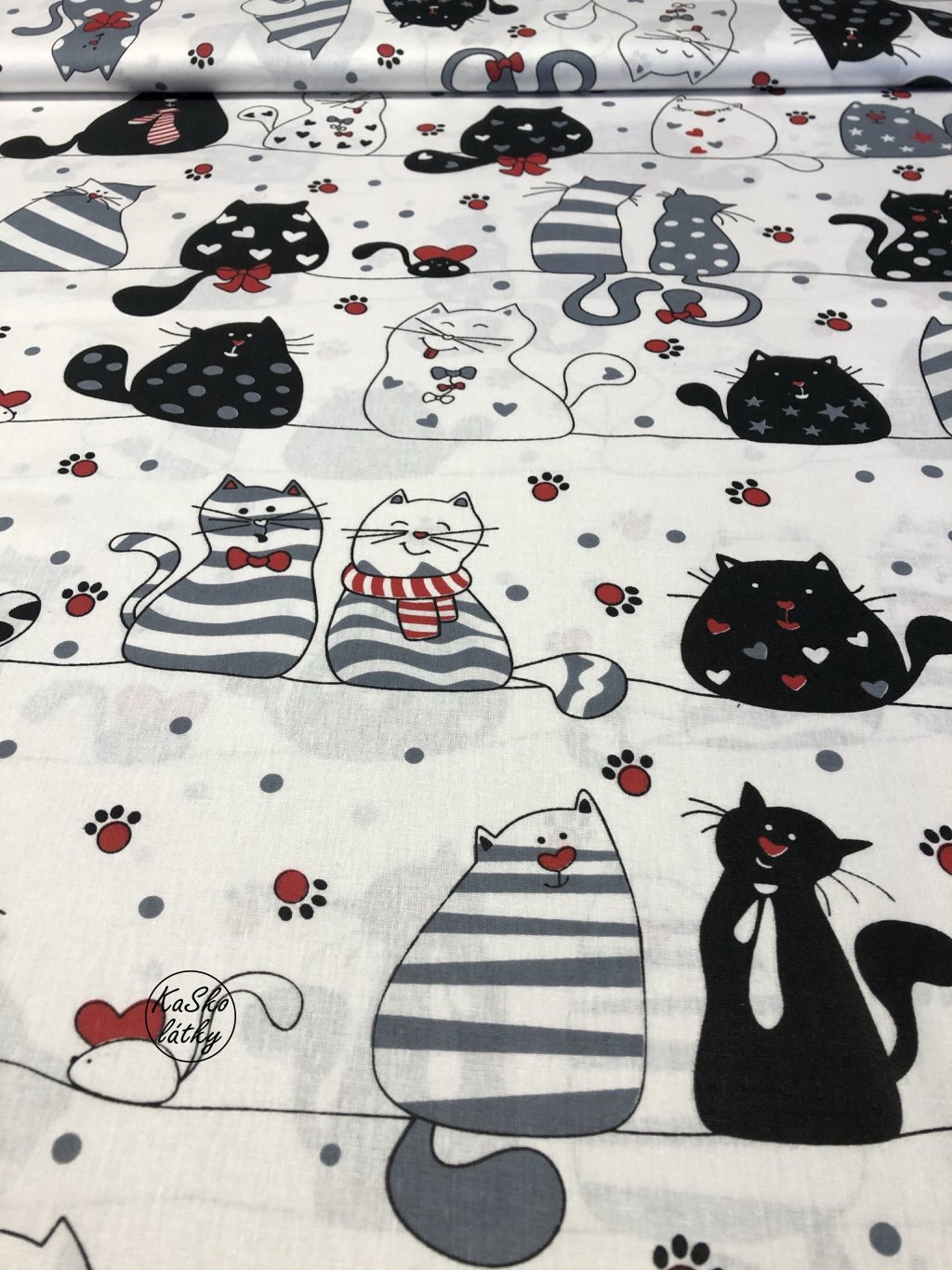Zbytek - Bavlněná látka kočky na drátě bílé 25 x 160 cm