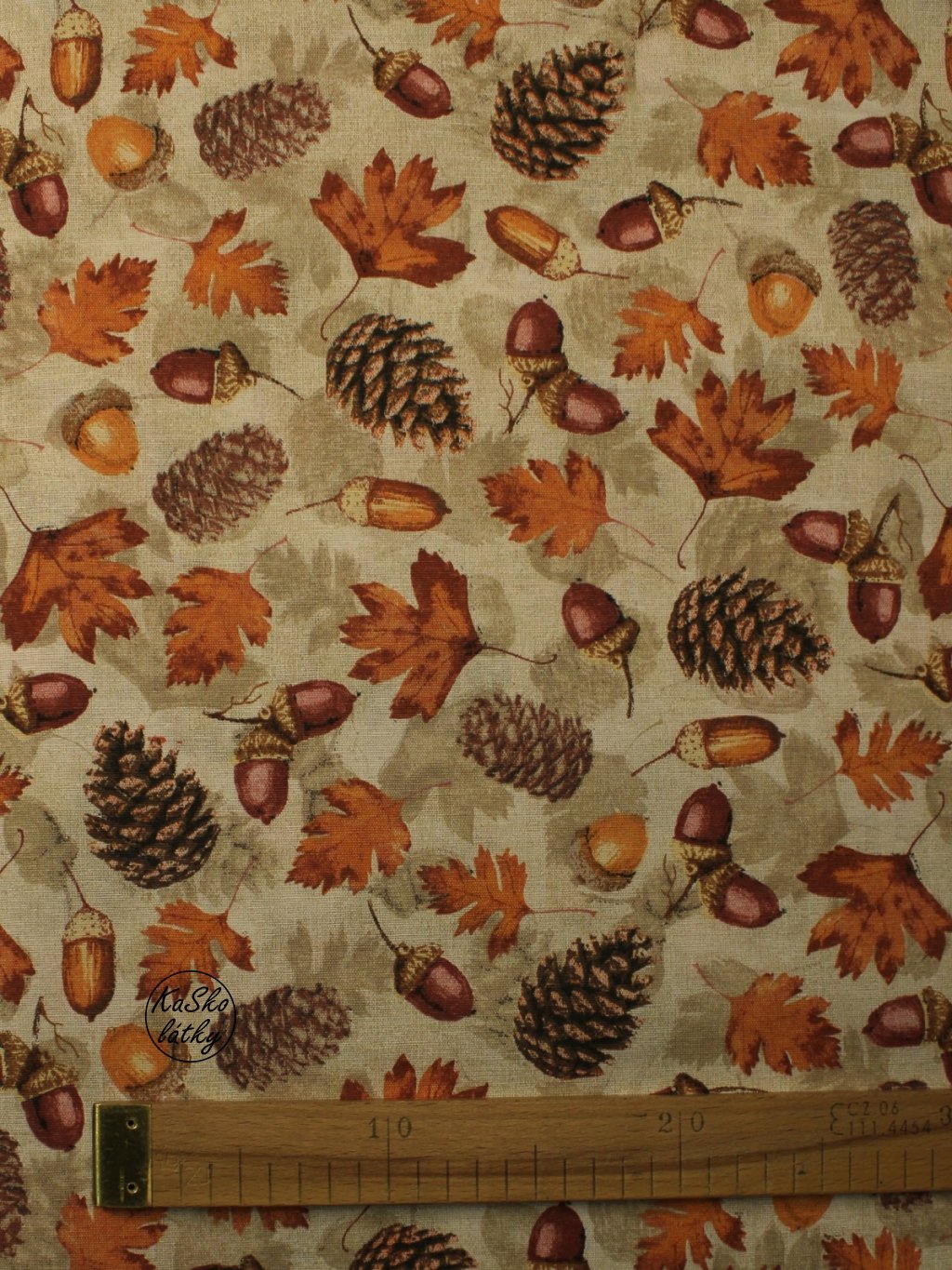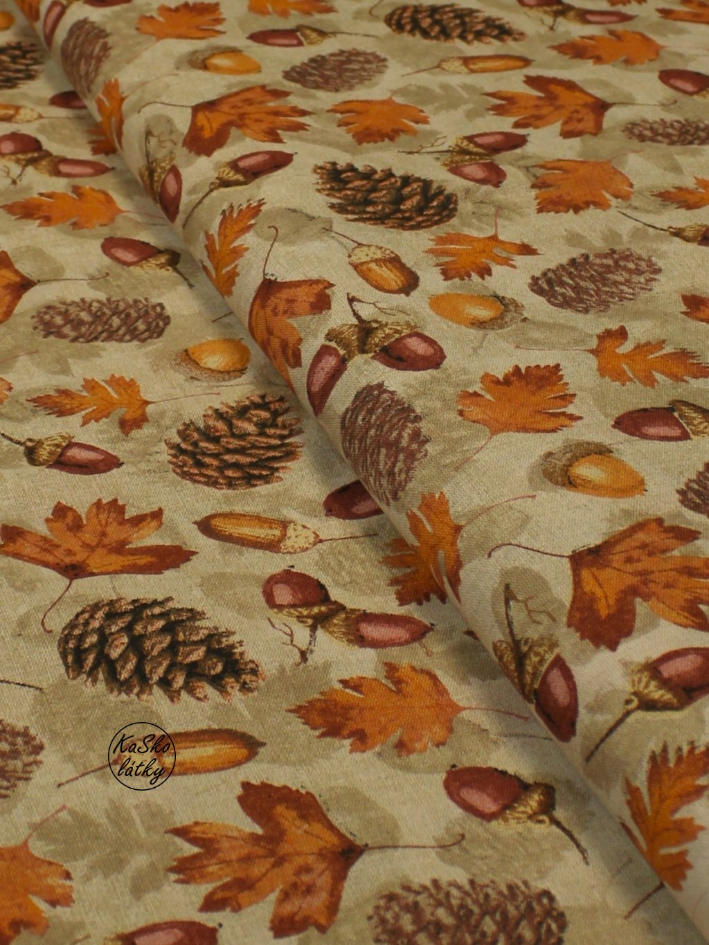 Zbytek - Režná látka šišky, žaludy a listy 35 x 130 cm